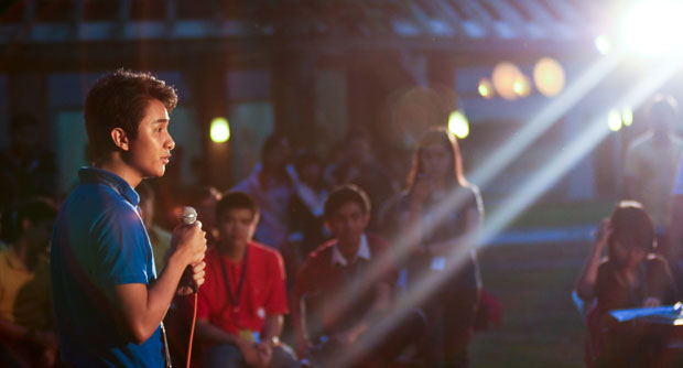Discourse. Sanggunian President Drew Copuyoc speaks before a diverse crowd during last election’s miting de avance. He now finds himself, along with many others, in a heated debate about campus politics. Photo by Abram P. Barrameda