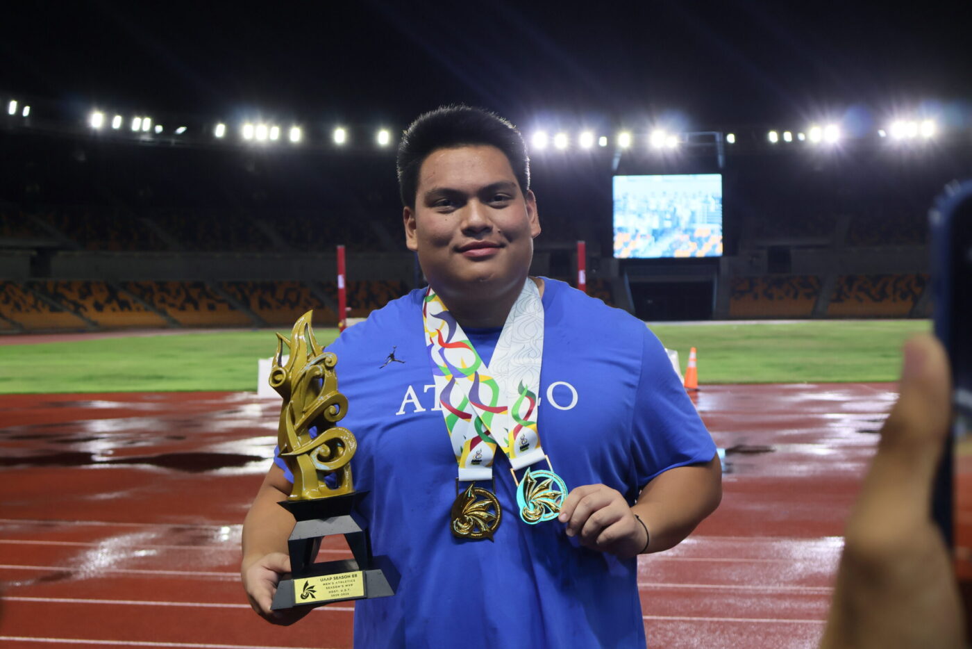 Ricaforte, who earlier struck gold in the Men’s Shot Put, added one more magical moment to close out his collegiate career, recording 52.62 meters on his best throw—setting a new UAAP record and securing his second gold medal of the championships, just days after nearly breaking the meet record in the shot put.